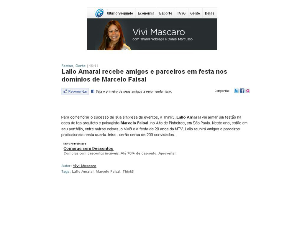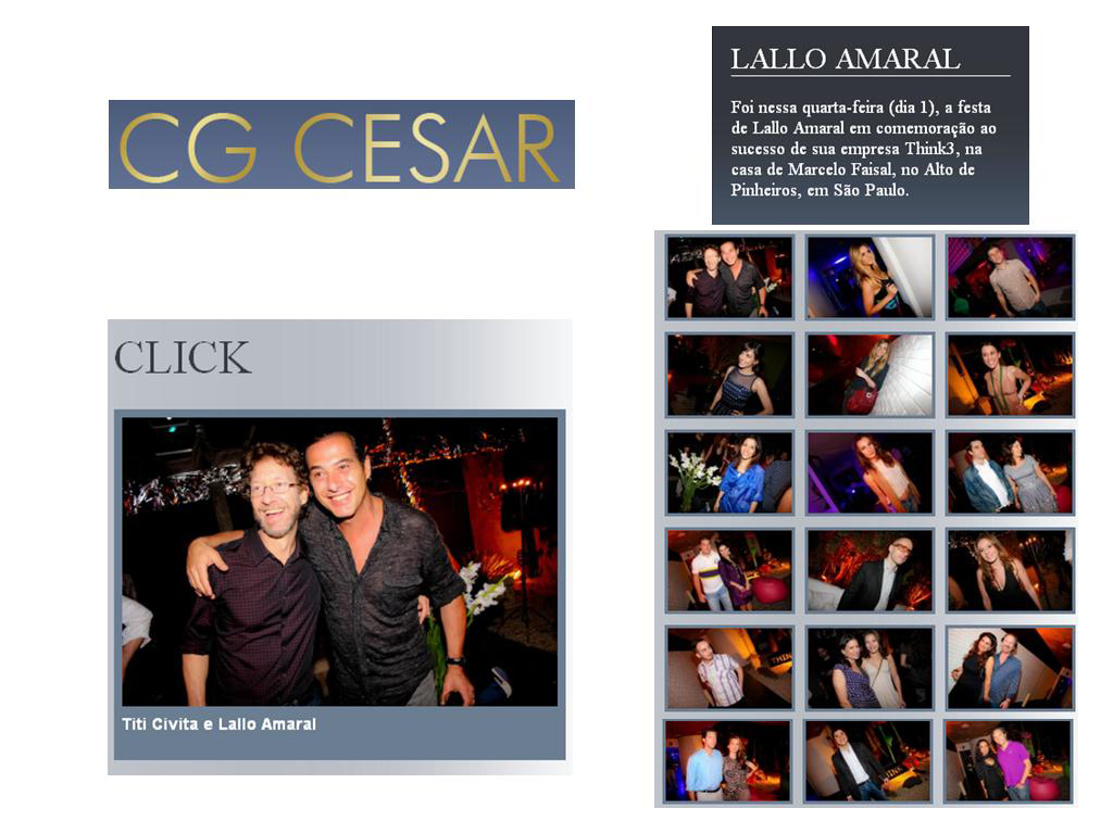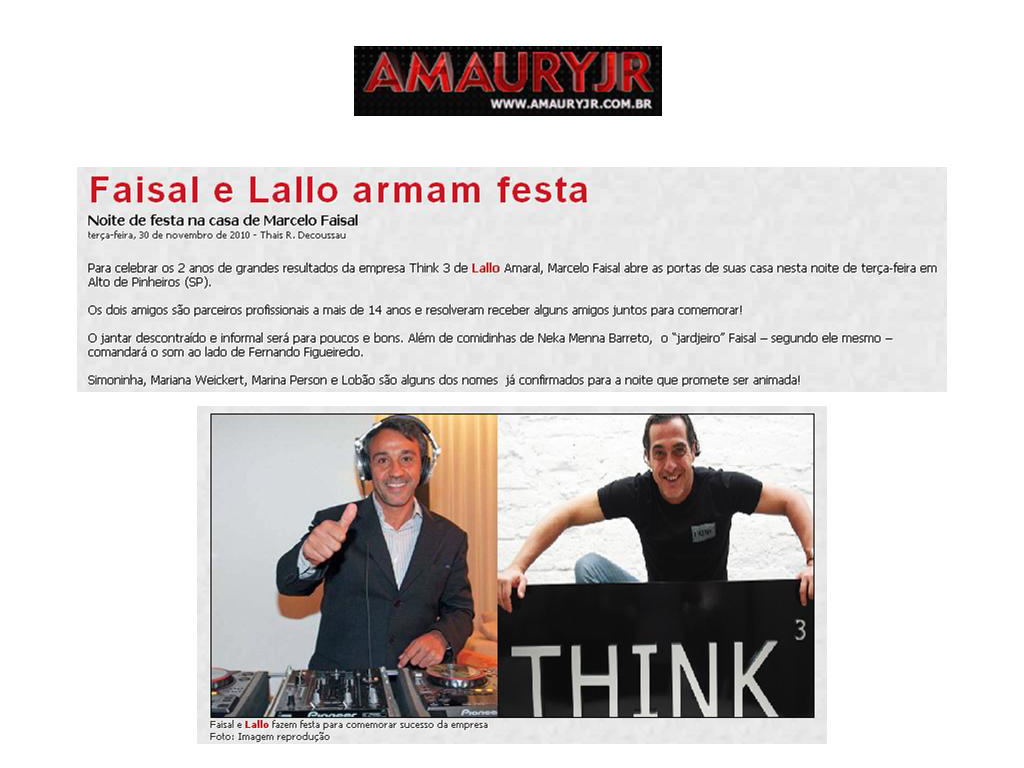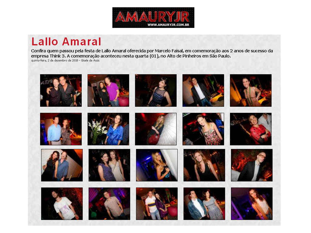 Lallo Amaral, proprietário da Think 3, é um profissional reconhecido por sua excelência em fazer eventos de extremo bom gosto e mecânica de trabalho impecáveis, onde tudo e todos funcionam perfeitamente. Seus trabalhos, sejam eles do tamanho que forem, sempre têm a mesma atenção e dedicação. Com esse tipo de atitude, Lallo adquiriu o respeito de todos com quem trabalha e imprimiu uma espécie de grife na área, a “Think3 de Lallo Amaral”.
